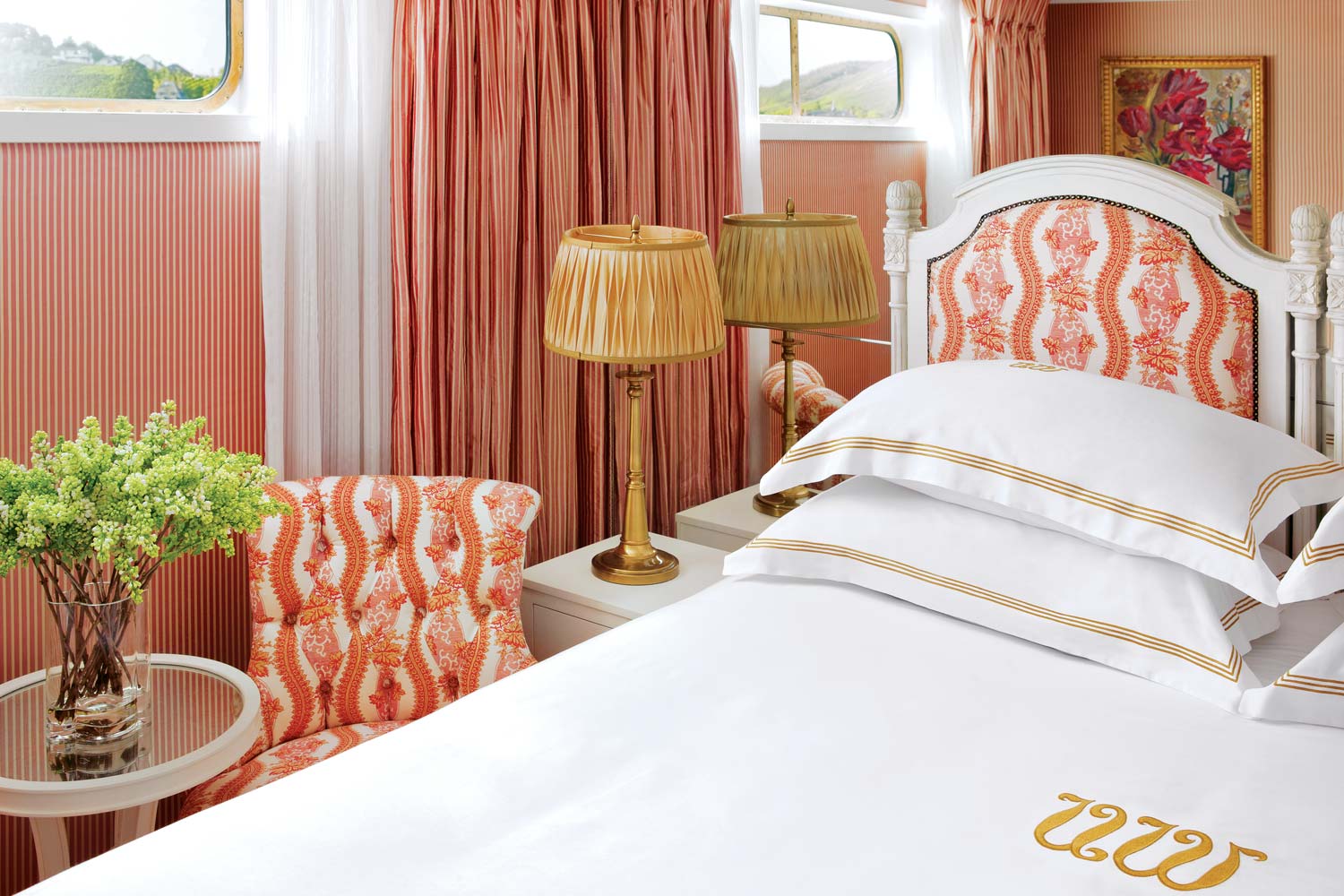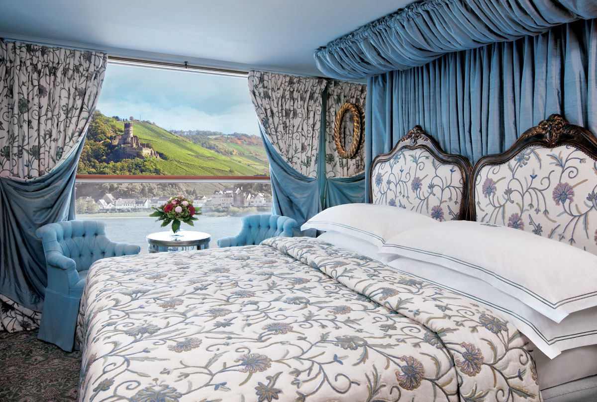 Lavishly appointed riverview stateroom (162 sq ft - 15 sq m).Handcrafted Savoir® Beds of England, built-in closet, hair dryer, safe, individual thermostat, flat-screen TV with infotainment center and satellite, and bottled water.Marble bathroom with Asprey bath and body products, plush towels, towel warmer, cozy bathrobes and slippers.