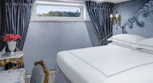 Lavishly appointed riverview stateroom (194 sq ft - 18 sq m) with a French balcony.Handcrafted Savoir® Beds of England, built-in closet, hair dryer, safe, individual thermostat, flat-screen TV with infotainment center and satellite, and bottled water.Marble bathroom with Asprey bath and body products, plush towels, towel warmer, cozy bathrobes and slippers.