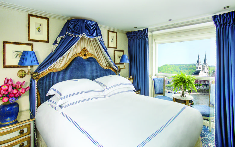 Lavishly appointed riverview staterooms. All staterooms have handcrafted Savoir® of England beds, built-in closets, a hair dryer, safe, individual thermostat, flatscreen TV with infotainment center, and mineral water. Marble bathrooms include L’Occitane en Provence products, plush towels, towel warmer, cozy bathrobes, and slippers.