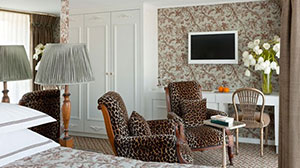 The Royal Suite has a handcrafted Savoir® of England bed, 100% Egyptian cotton linens, and a choice of pillows. Other amenities include built-in closets, hair dryer, individual thermostat, flat-screen TV with infotainment centre and satellite, bottled water, and a safe. Marble bathrooms feature L’Occitane en Provence bath and body products, plush towels, towel warmers, heated mirrors, and bathrobes and slippers.All suites are uniquely decorated and have additional amenities and services, including in-suite special butler service, packing and unpacking assistance, full breakfast menu, daily fruit and cookie plate, elegant evening snack, robes and slippers, iPod® docking station, Nespresso coffee machine and fine teas, fully stocked mini bar, free laundry and shoe shine service, bottle of wine upon arrival, Hermés bath products and a special dinner in Bar du Leopard.The Royal Suite offers additional benefits, including a separate and spacious living room, and a bathroom with a separate rain shower and tub, as well as a secluded toilet and bidet area.